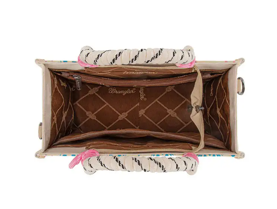 This eye-catching pink aztec canvas bag brings bold prints and practical features to your everyday carry. The sturdy rope handle pairs perfectly with a detachable, adjustable crossbody strap for versatile styling. Dual zip closures—one at the top and one inside—keep your essentials secure, while slip pockets offer quick-access storage. Stamped with the iconic Wrangler logo badge, this bag blends authentic western flair with modern functionality. Perfect for adventures big and small.