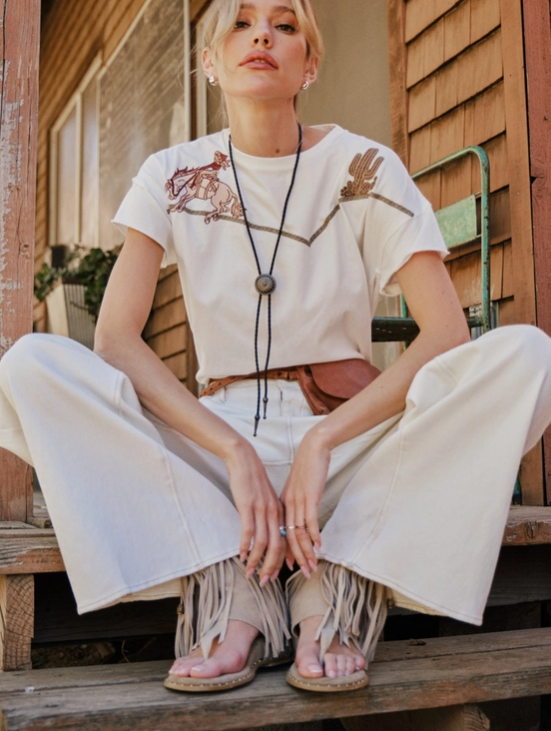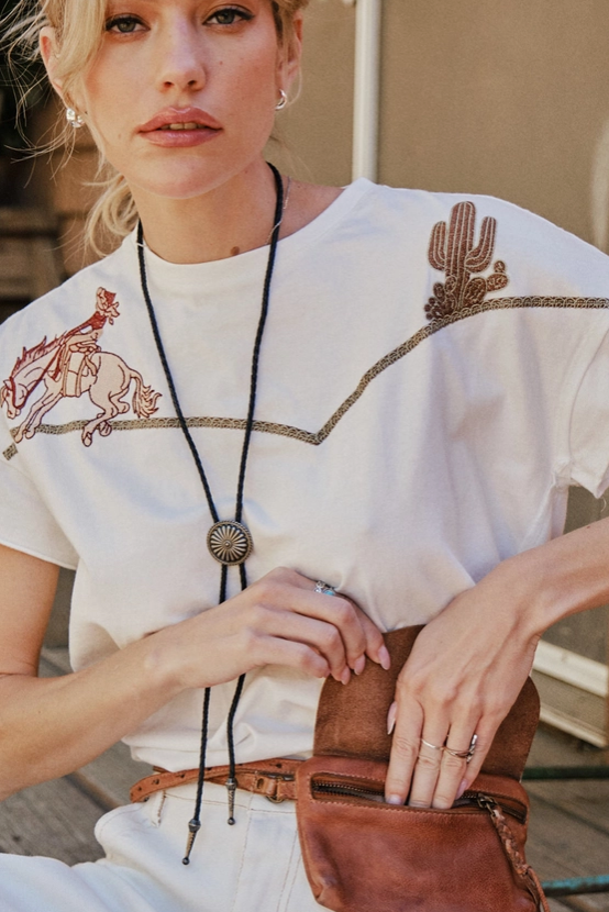 This garment-washed graphic T-shirt combines comfort and style with its 100% cotton fabric and relaxed dolman sleeves. Featuring a distinctive western yoke and detailed shoulder embroidery, it delivers a subtle yet refined western-inspired aesthetic. Perfect for those seeking both casual wear and expert craftsmanship in their wardrobe.