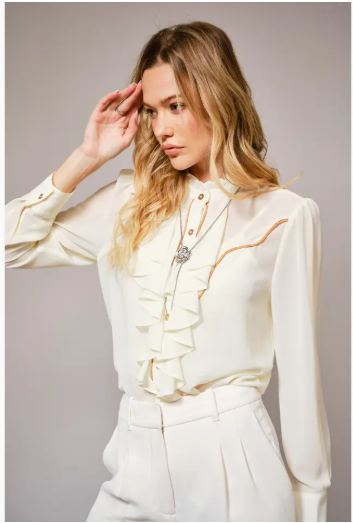 Light weight button-up blouse featuring a ruffled front, jewelled silver necklace and contrast piping. Designed with a high neck line and long sleeves.